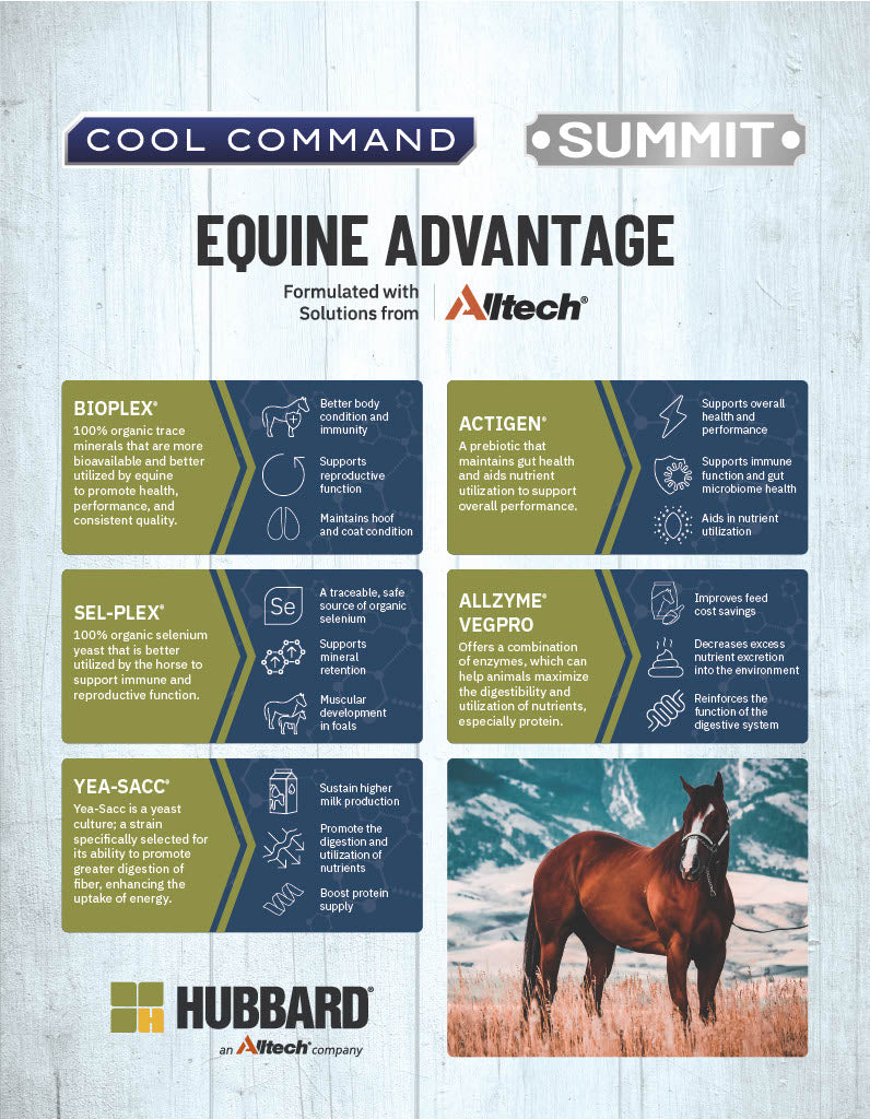 Cool Command horse feeds are made with 100% organic Alltech® trace minerals. Organic trace minerals are more easily absorbed, retained and utilized, thereby contributing to better overall health and immune function, in addition to improved exercise performance and recovery.