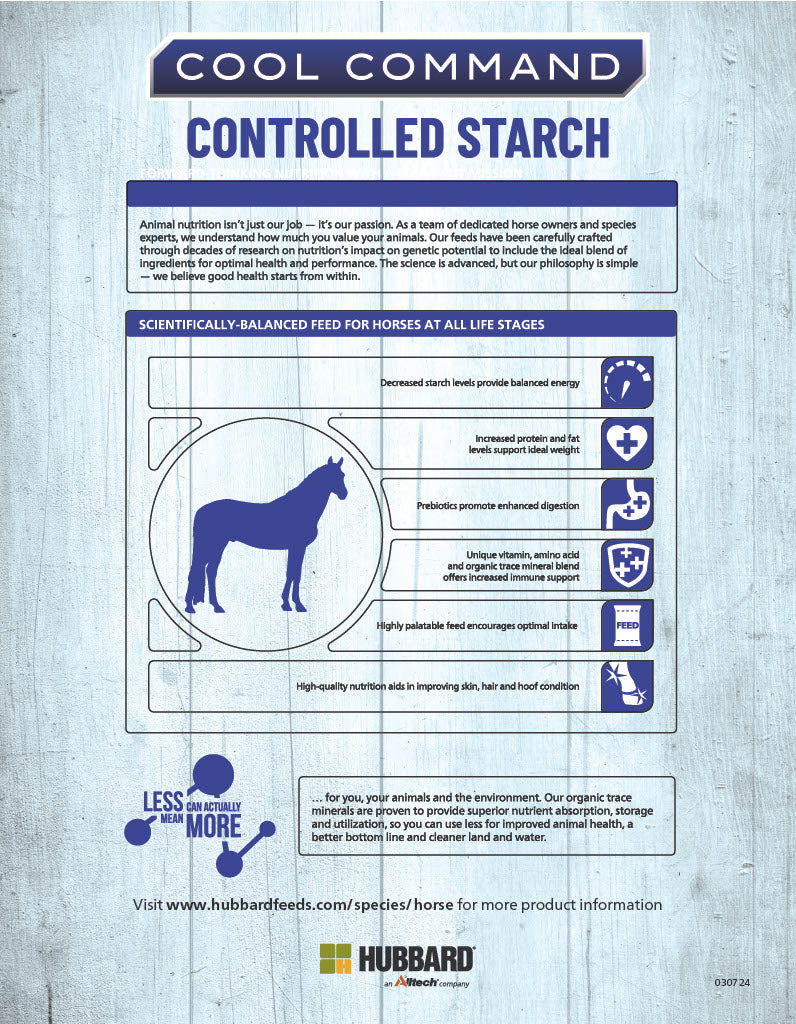 Cool Command's high-quality equine nutrition aids in improving skin, hair and hoof condition, and the decreased starch levels offer cool energy for horses who generate enough of their own.