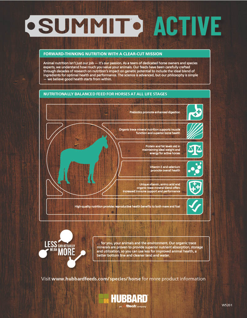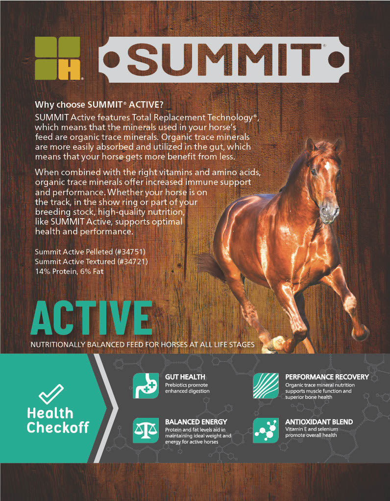 Summit® Active is a 14% protein, 6% fat feed that features highly digestible energy sources tailored to meet the needs of performance horses.